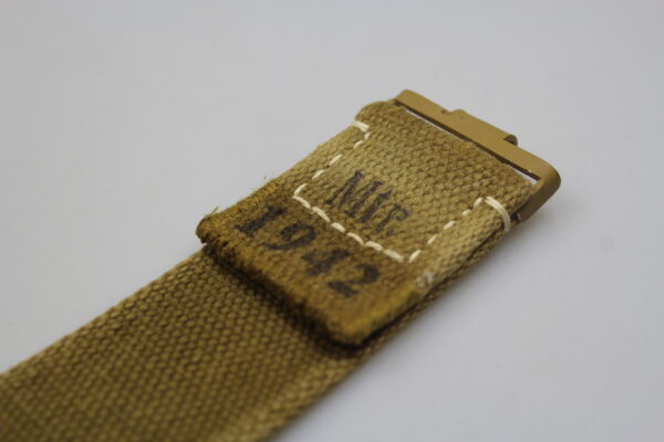 Cinturone tropicale da truppa della Wehrmacht, con patta di regolamentazione in cuoio, marcato con produttore e datato 1942, lunghezza cm 100. Poco usato, buono stato di conservazione.