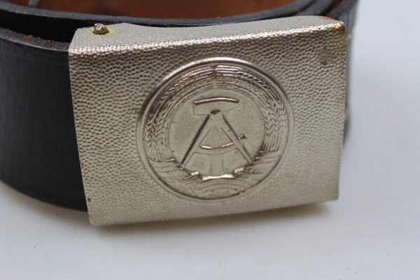 Cinturone fatto in cuoio nero completo di fibbia da truppa della ex DDR, lunghezza cm 88. Usato, buono stato di conservazione.