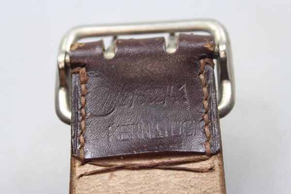 Cinturone da Ufficiale con fibbia a due ardiglioni, fatto in cuoio marrone scuro, alto 40 mm, marcato con RZM e visto questo particolare, usato da corpi paramilitari legati al Partito. Lunghezza cm 120. Usato pochissimo.