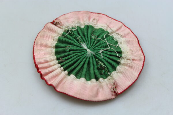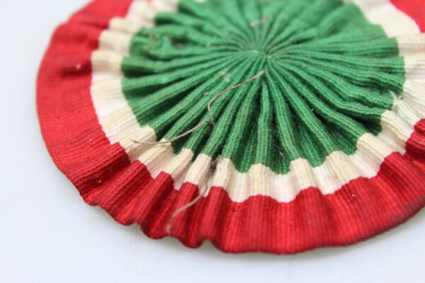 Coccarda tricolore per casco coloniale, anche per moretto dei Bersaglieri, del Regio Esercito Italiano della seconda Guerra Mondiale, fatta in cotone, diametro cm 8,5. Poco usata, buono stato di conservazione.