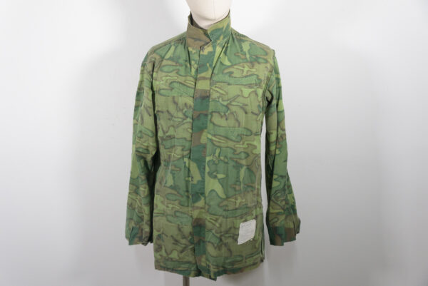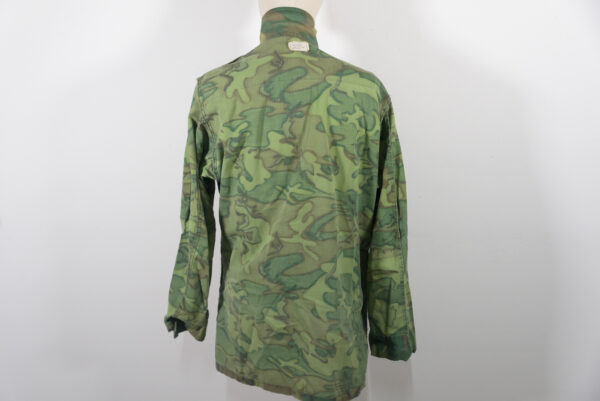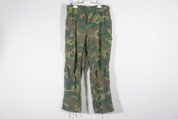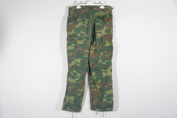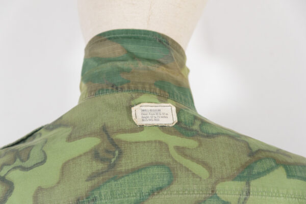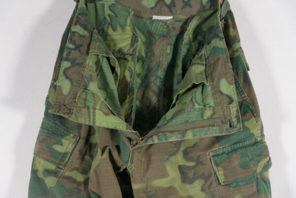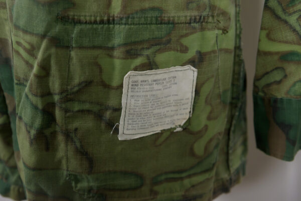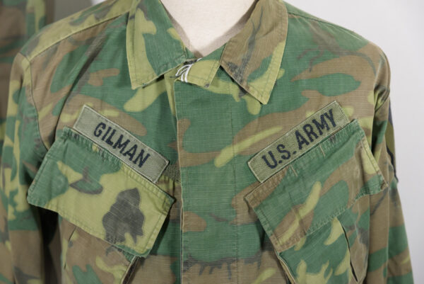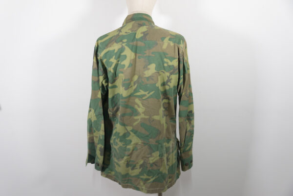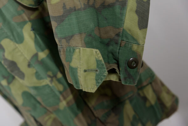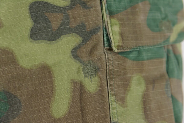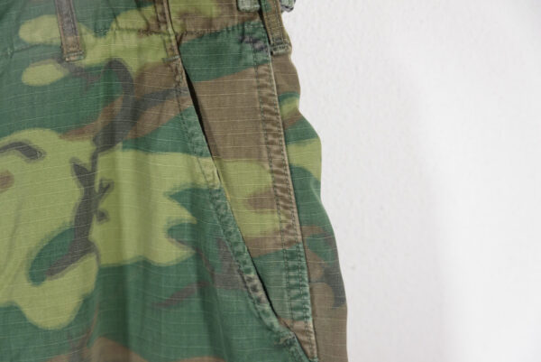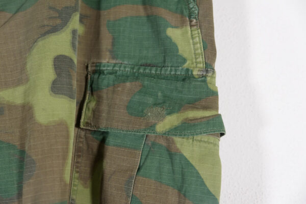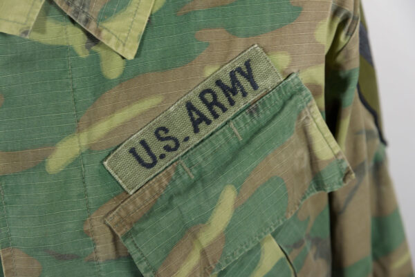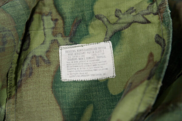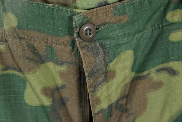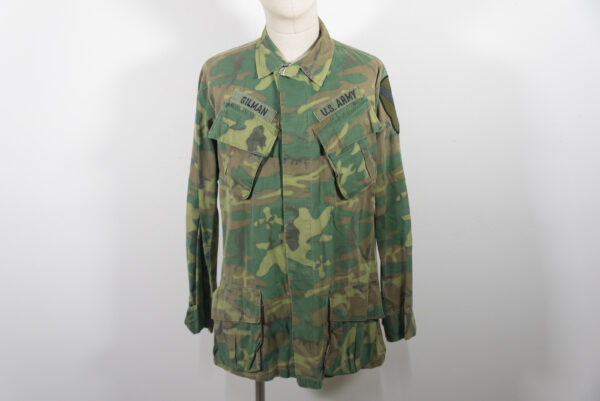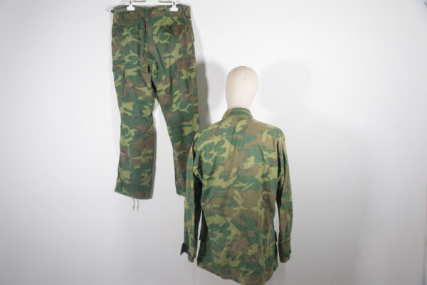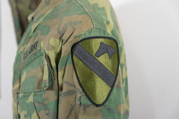 Completo, giacca e pantaloni “Jungle ripstop” mimetico ERDL, DSA 1969 entrambi i pezzi, periodo Vietnam. Giacca completa dei suoi corretti attributi, con patch “subdued” della Prima Divisione di Cavalleria, completa delle due etichette di riferimento. Pantaloni completi in ogni sua parte inclusa etichetta di riferimento. Complessivamente buono stato di conservazione.