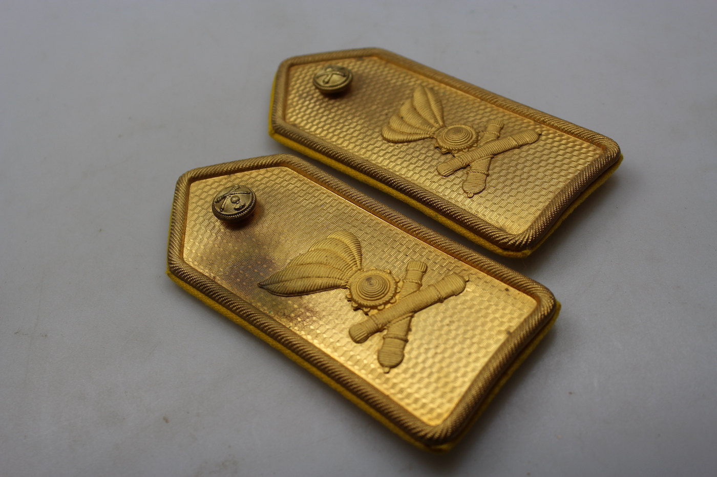 Controspalline M.34 a lastra dorata, da Ufficiale Inferiore di Artiglieria del Regio Esercito Italiano, complete di bottoni a vite. Usate, buono stato di conservazione.