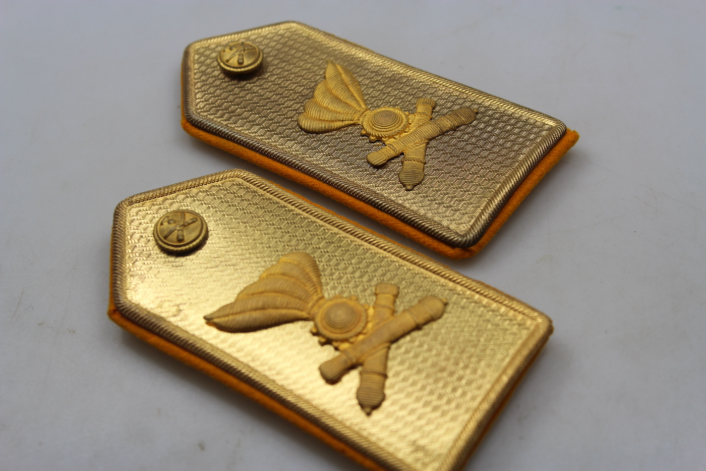 Controspalline M.34 a lastra dorata, da Ufficiale Inferiore di Artiglieria Pesante Campale del Regio Esercito Italiano, complete di bottoni a vite. Usate, buono stato di conservazione.
