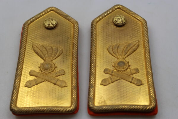 Controspalline M.34 a lastra dorata, da Ufficiale Superiore di Artiglieria del Regio Esercito Italiano, complete di bottoni a vite. Usate, buono stato di conservazione.