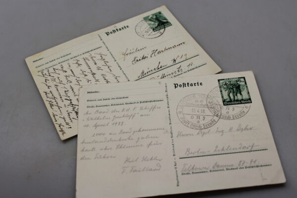 Coppia cartoline postali fatte per commemorare le annessioni di Austria e Sudeti al Reich Germanico. Entrambe “viaggiate” in buono stato di conservazione.