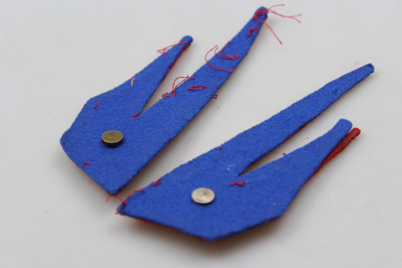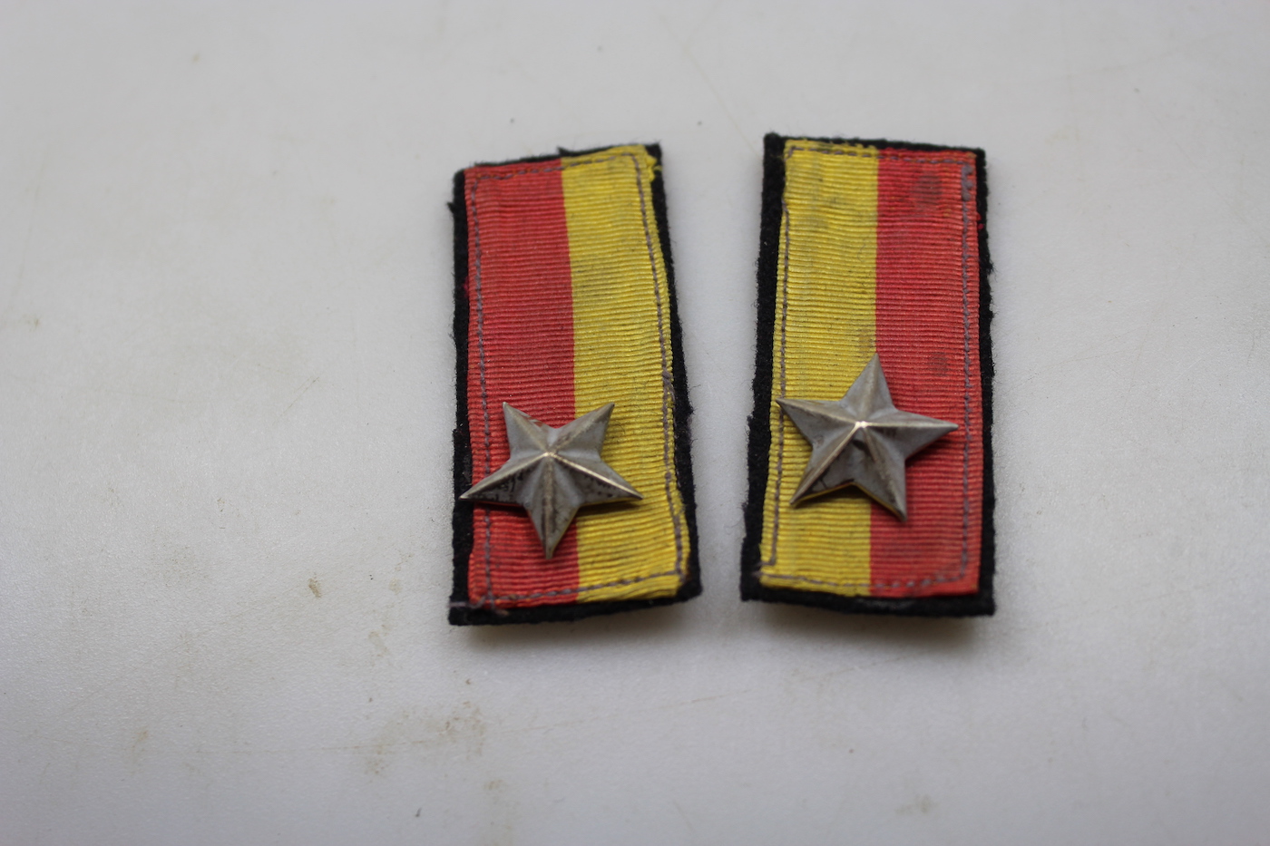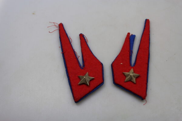 Coppia di mostrine per giacca M.40 da Ufficiale Carrista del Regio Esercito Italiano della Seconda Guerra Mondiale, complete di stellette zigrinate a vite. Usate, tolte da giacca, buono stato di conservazione.