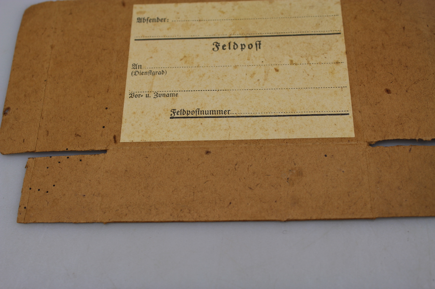 Coppia di pacchetti Feldpost, componibili fatti in cartone, con cui le famiglie inviavano piccoli generi di conforto ai propri congiunti impegnati al fronte. Mai stati usati, fondo di magazzino.