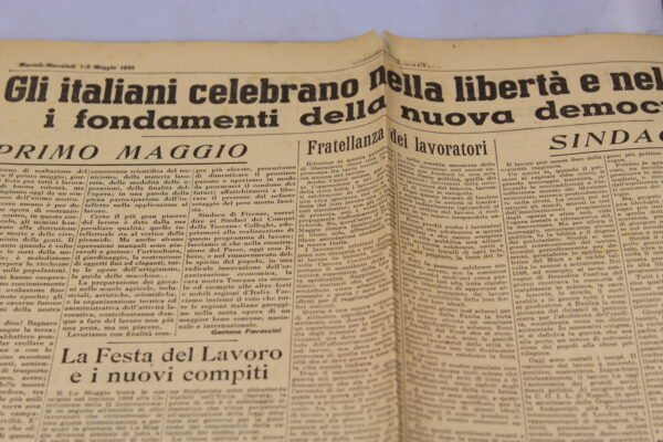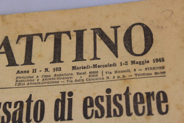 Quotidiano “Il corriere del Mattino” dei giorni 1-2 maggio 1945, titolo della prima pagina “La potenza militare Tedesca in Italia, ha cessato di esistere”. Completo, condizioni come da foto.