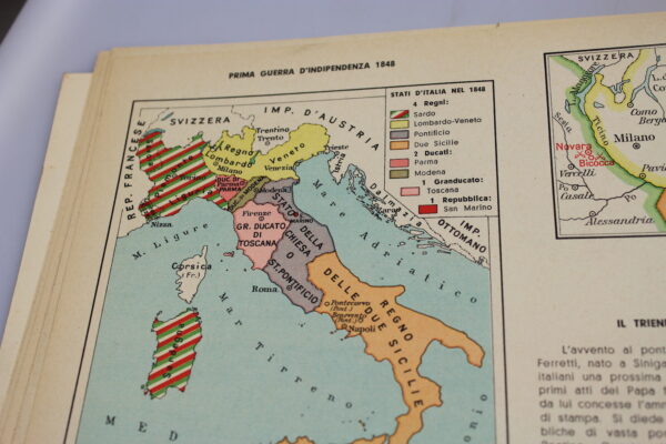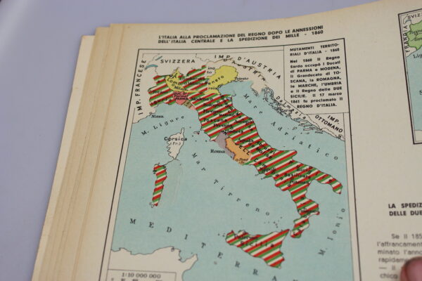 Atlante storico  De Agostini – Monti, illustrato della storia d’Italia dal Risorgimento alla fondazione dell’Impero, completo di 18 carte traforate per vedere l’evoluzione dell’ Italia in quegli anni. Buono stato di conservazione.