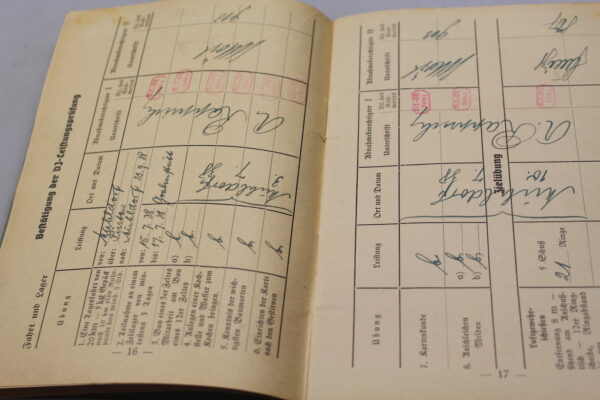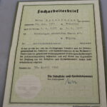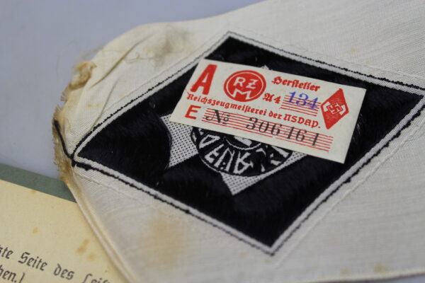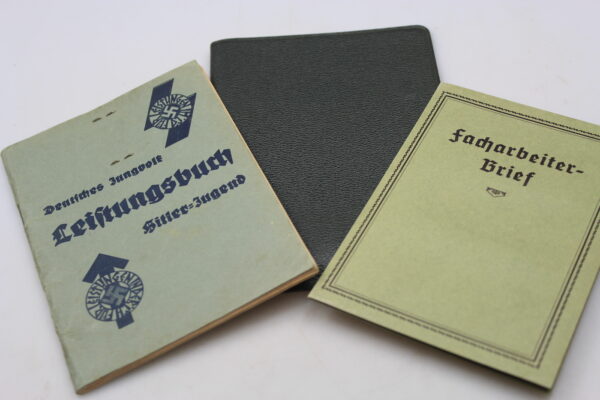 “Fur Leistungen im Deutsche Jungvolk” – Distintivo di produzione Be-Vo completo di etichetta RZM e libretto/attestato con foto del ragazzo iscritto DJ. Inoltre, allo stesso nominativo, anche attestato di operaio specializzato, presso una fabbrica di metalli dal 1939 al 1942. Incluso anche un portadocumenti in simil pelle. Tutto in buono stato di conservazione.
