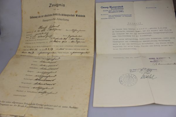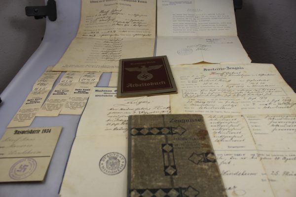 Gruppo di documenti di una unica famiglia: un Arbeitsbuch, un interessante Ausweis e altri documenti. Ottimo stato di conservazione.