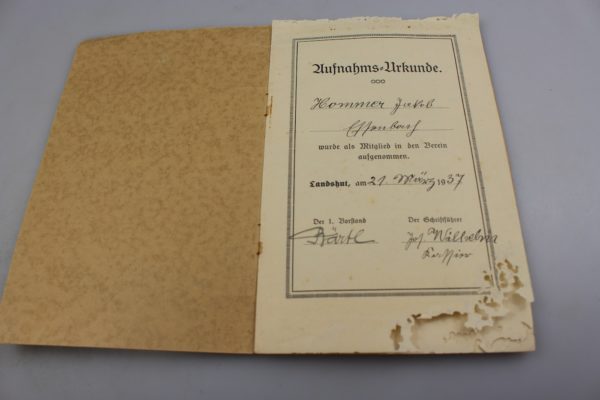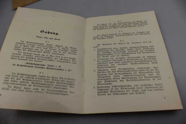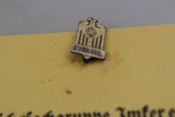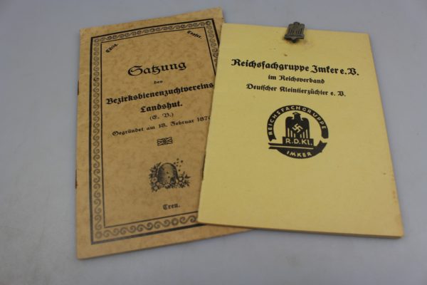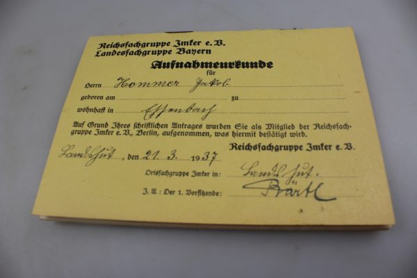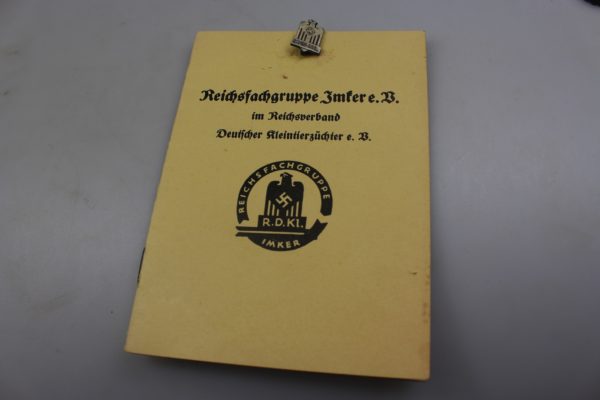 Due tessere e distintivo con Urkunde per un membro “produttivo” della R.D.KL.,Associazione Nazionale Apicoltori del III° Reich. Buono stato di conservazione.