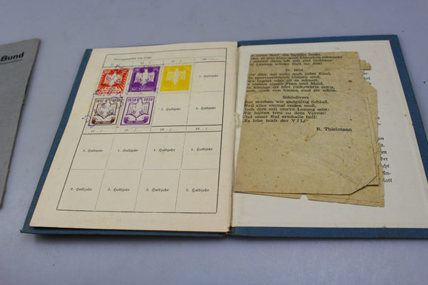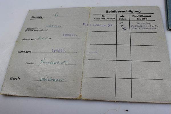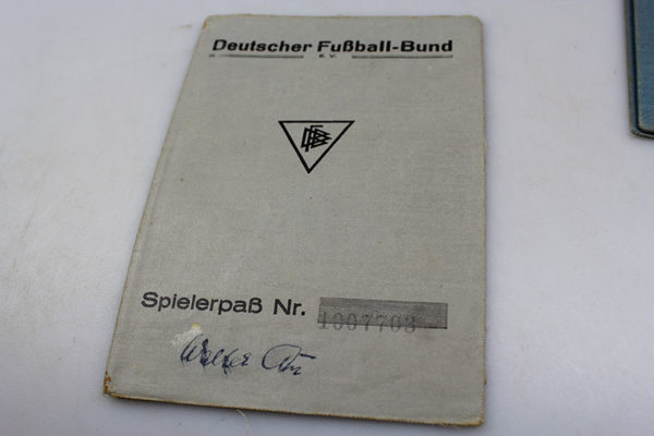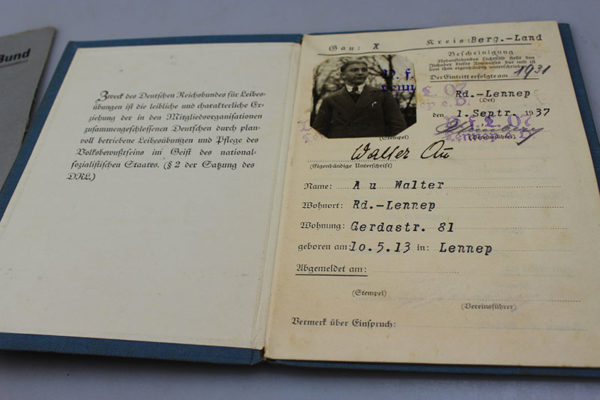 Tessera di un iscritto al Deutscher Reichsbund fur Leibesubungen, Associazione Tedesca del Reich per l’esercizio fisico, completa di foto e con insieme altra tessera di una società di football. Buono stato di conservazione.