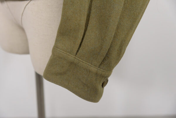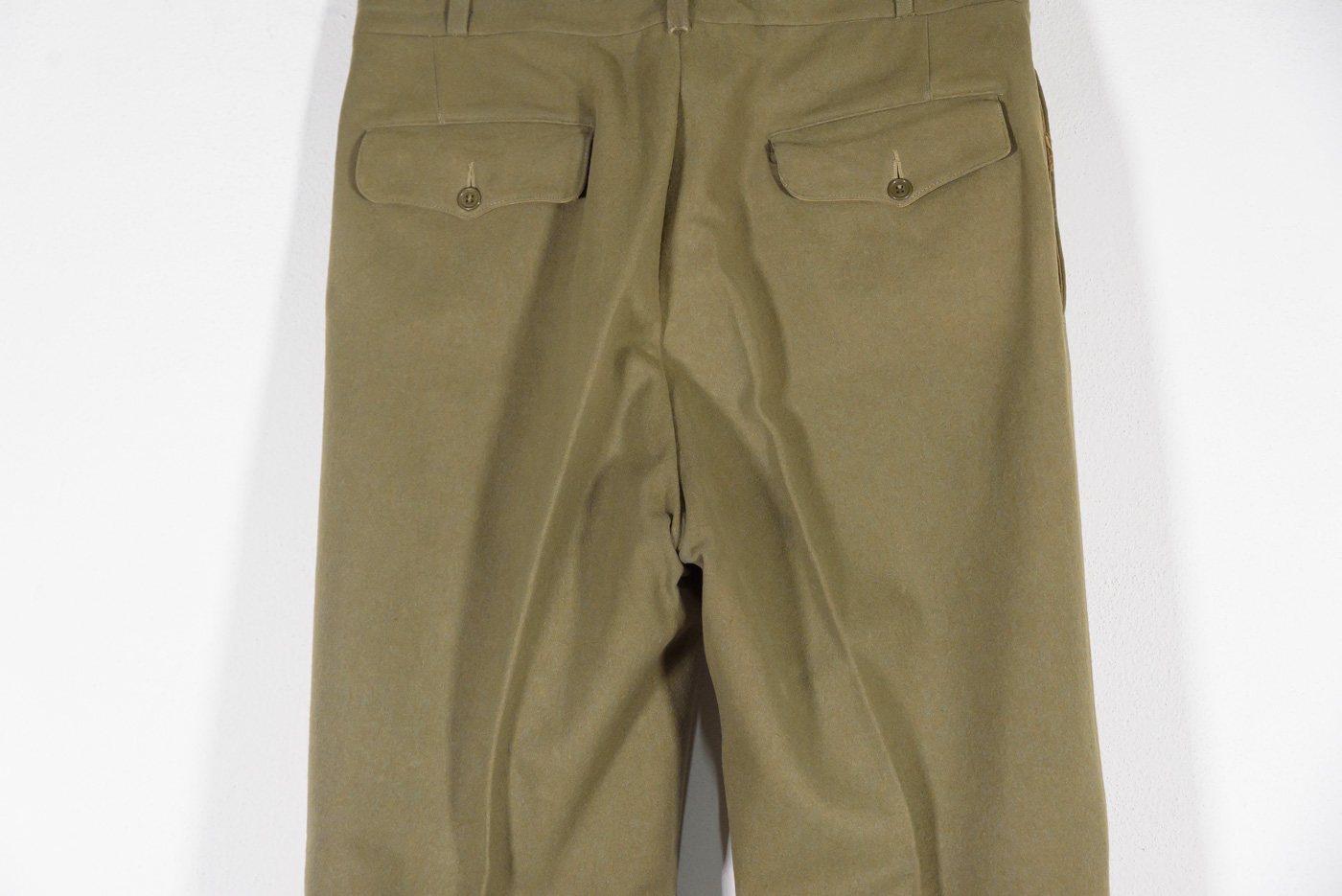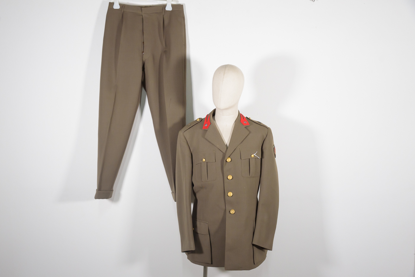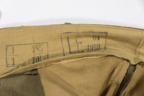 Drop, giacca a 2 tasche, stile Battle Dress, e pantaloni dritti, fatti in panno kaki, da Sottotenente di una Scuola di Fanteria dell’Esercito Italiano. Giacca completa dei suoi corretti attributi, entrambi i capi marcati 1959. Usato, buono stato di conservazione, taglia grande.