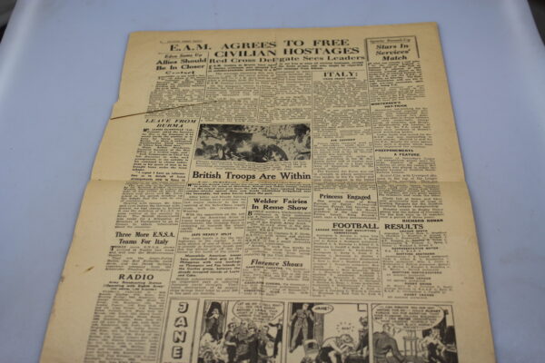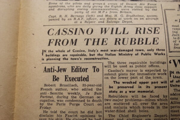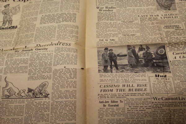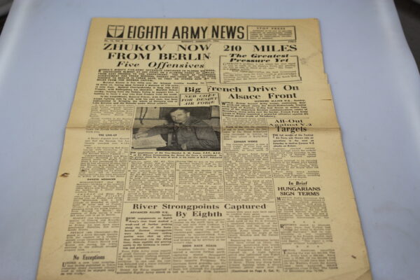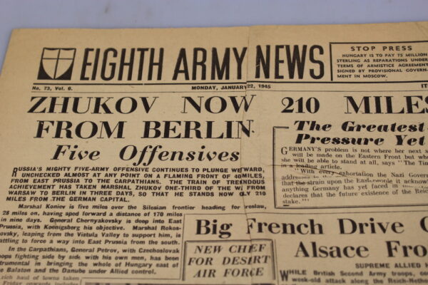 Giornale dell’Ottava Armata Inglese, titolo del giorno “Zhuckov a 210 migla da Berlino”, in seconda pagina si parla anche di Cassino. Usato, buono stato di conservazione.