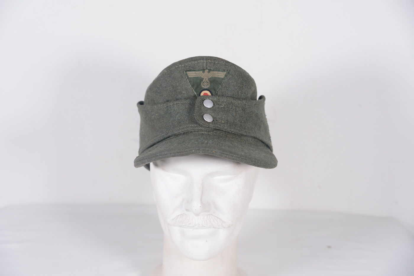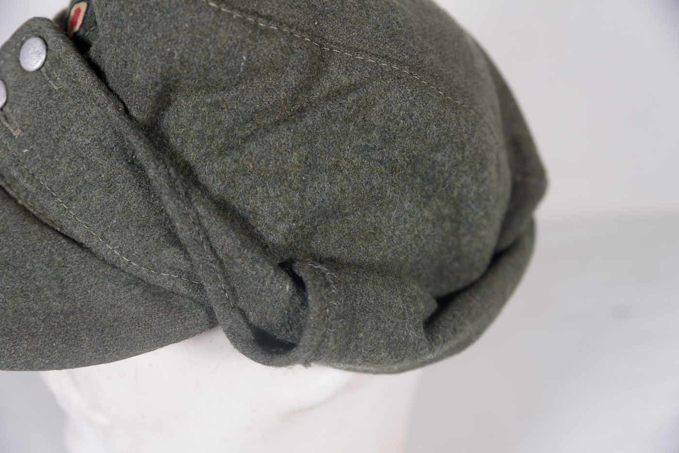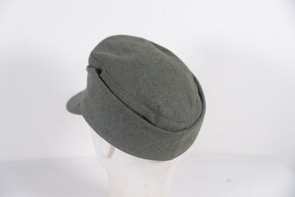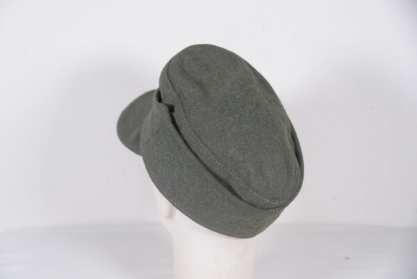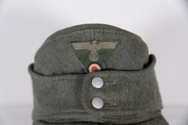 Einheitsfeldmutze, berretto M.43 Heer della Seconda Guerra Mondiale, fatto in panno feldgrau, fregio trapezioidale Be-Vo, cucito a mano, marcato internamente. Usato, buono stato di conservazione, riparazione sulla falda sinistra eseguita alla perfezione, non visibile neppure con foto nel dettaglio.