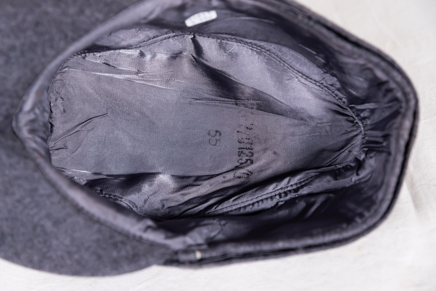 Einheitsfeldmutze M.43 da truppa della Luftwaffe, fatto in panno tipico blaugrau e completo di fregio trapezioidale ricamato in filo di cotone, fodera interna in rayon. Marcato con RBNr e con taglia. Molto buono lo stato di conservazione.