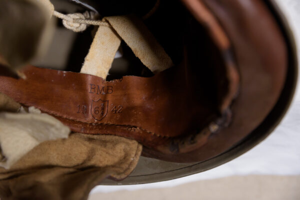 Elmetto Inglese “Dispatch Rider”, da motociclista Inglese della Seconda Guerra Mondiale, marcato con produttore BMB, Briggs Motor Bodies Ltd of Dagenham, datato 1942. Usato, buono stato di conservazione.