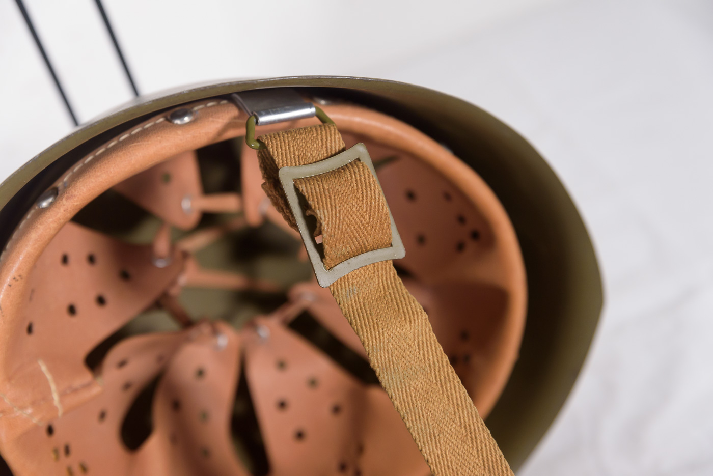 Elmetto m.33,Esercito Italiano anni 1960/80, colorazione kaki e fregio frontale di Sanità, completo di liner, sottogola e rete regolamentare per la mimetizzazione. Usato, buono stato di conservazione, taglia 57.