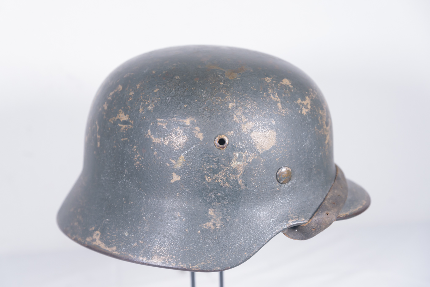 Elmetto M.35 della Luftwaffe, si evince dalla colorazione tipica blaugrau della parte interna, mentre esternamente si vede una prima mimetizzazione in colora giallo, successivamente coperta da un’altra colorazione verde antiriflesso. Produttore ET, taglia 64/57, completa di liner fatto in alluminio con rinforzo e completo di sottogola adeguato. Usato, buono stato di conservazione.