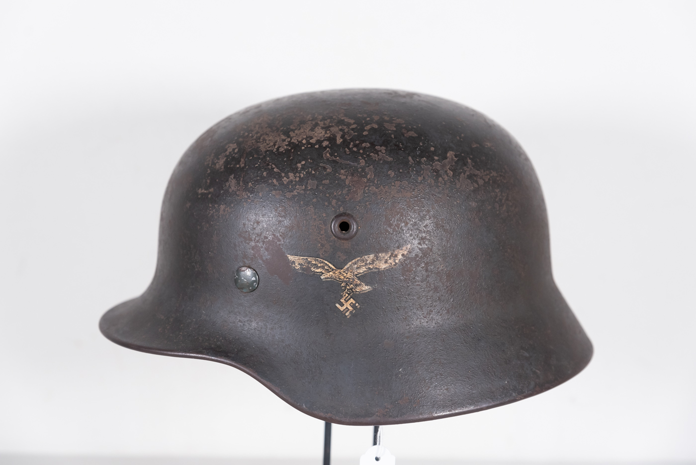 Elmetto M.40 monodecal della Luftwaffe, in colorazione tipica blaugrau, produttore Quist, taglia 64/57, completo di interno e mancante del sottogola. Particolare interessante, la sovrapposizione di due decal della Luftwaffe. Usato, buono stato di conservazione, bella patina.