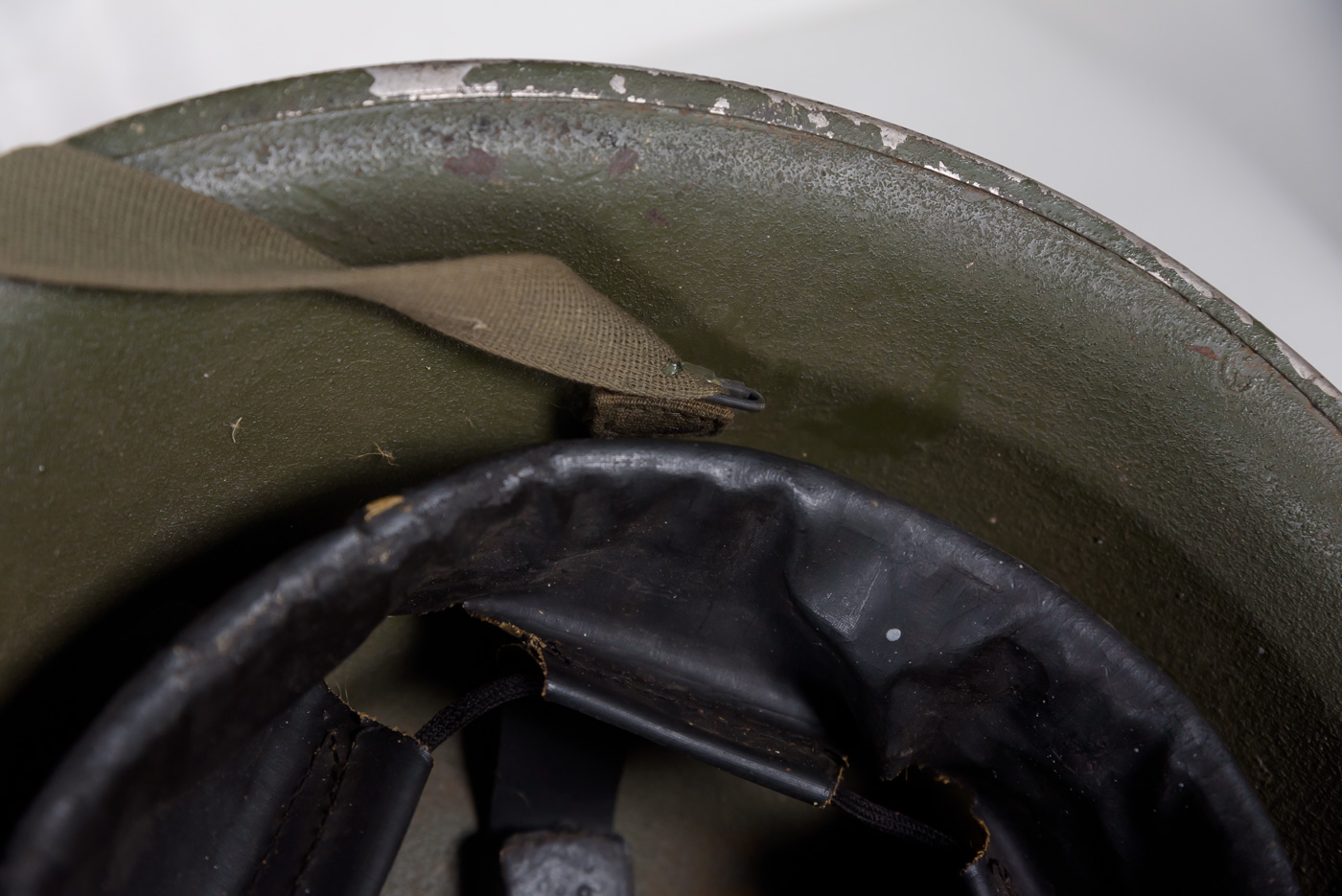 Elmetto Mk3 Inglese, usato anche dai Canadesi durante lo sbarco in Normandia, completo di sottogola corretto di secondo tipo e liner marcato con produttore e datato 1944. Usato, buono stato di conservazione.
