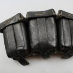 Giberna tripla per caricatori del K.98, fatta in cuoio nero, marcata con produttore e datata 1942. Completa dei separatori interni. Usata, buono stato di conservazione.