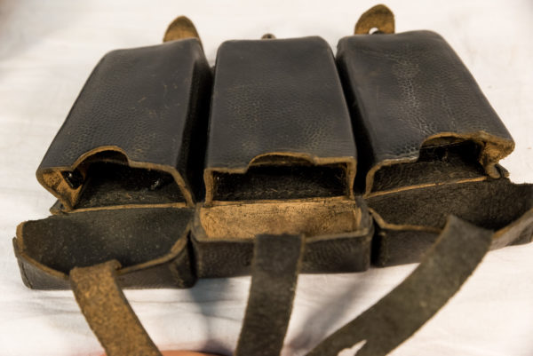 Coppia di giberne triple per caricatori del K.98, molto simili tra loro sia come costruzione che come usura, fatte in cuoio nero, complete dei separatori interni. Usate in buono stato di conservazione.