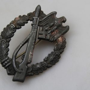 Fallschirmjäger Abzeichen – Brevetto da Paracadutista della Luftwaffe della Seconda Guerra Mondiale, versione di fine guerra fatta con serto in zinco e aquila in cupal, non marcato, per caratteristiche di costruzione attribuibile al produttore Steinhauer & Luck – Ludenscheid. Usato, buono stato di conservazione, bella patina.