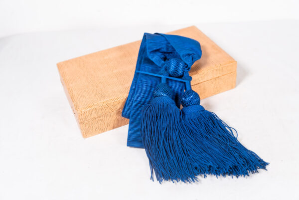 Fascia azzurra per Ufficiale REI, che veniva indossata in particolari occasioni, periodo Seconda Guerra Mondiale, completa di elegante scatola in cartone. Usata, buono stato di conservazione.