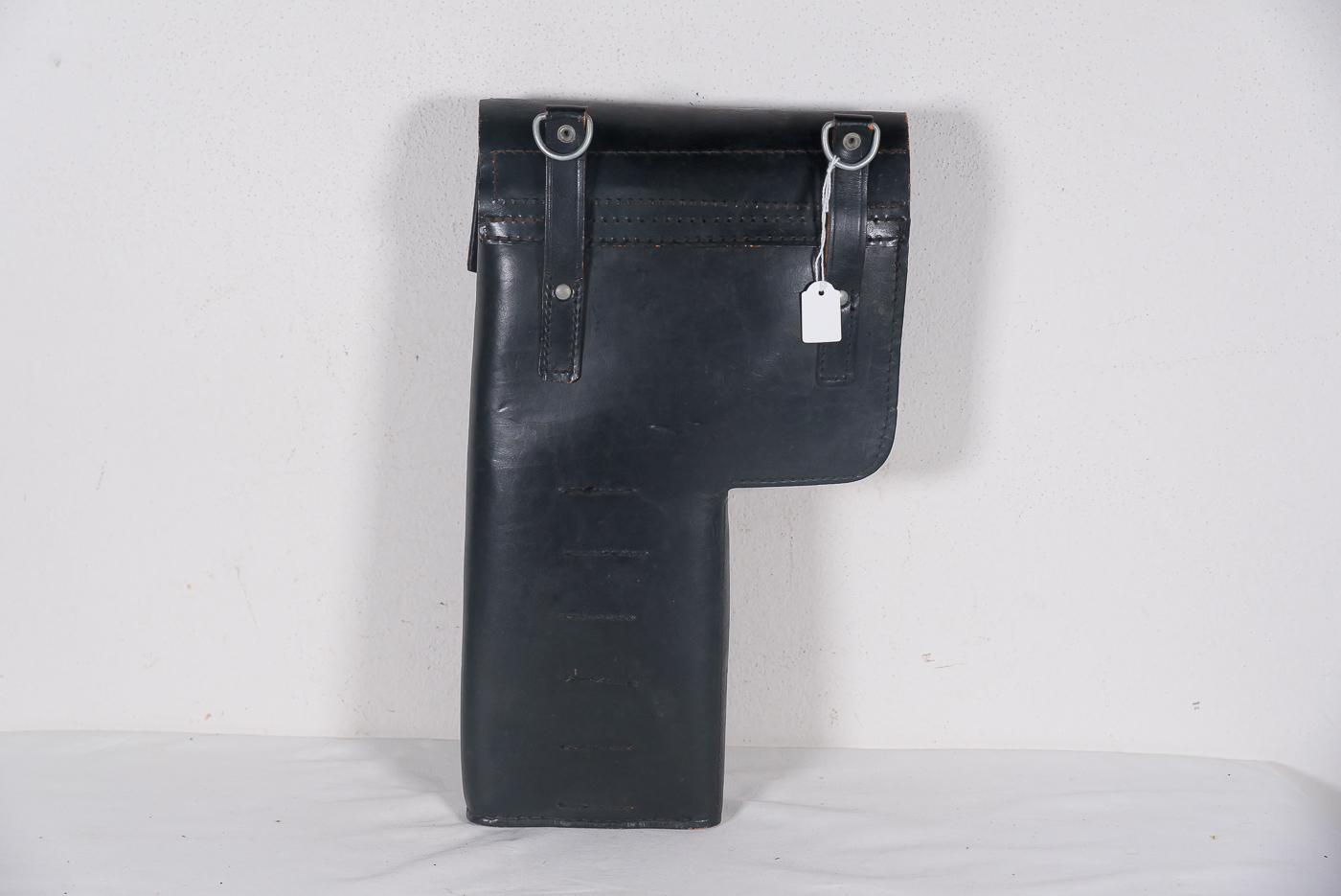 Particolare fondina per pistola lanciarazzi da segnalazione NVA-DDR, fatta in cuoio nero, cartucciera interna e completa di tracolla. Fondo di magazzino.