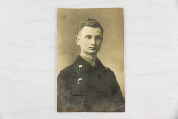 Foto da studio raffigurante un soldato di una Unità Panzer con tipica giacca nera di primo tipo nella versione profilata. Buono stato di conservazione.