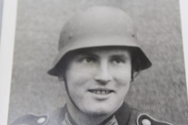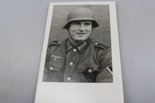 Foto da studio raffigurante un Gefreiter della Heer con elmetto. Buono stato di conservazione.