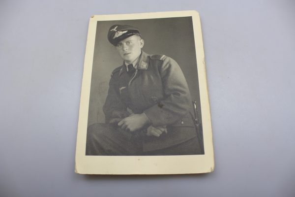 Foto da studio, formato post card, raffigurante un soldato della Luftwaffe con giacca Fliegerbluse e Schirmmutze. Buono stato di conservazione.