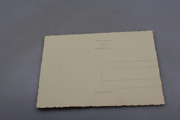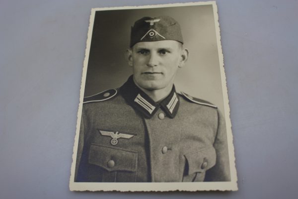 Foto da studio, formato post card, raffigurante un soldato della Heer in uniforme M.36 con fielscap M.38 con waffenfarbe. Stato di conservazione come da foto.