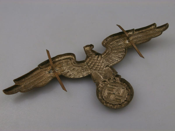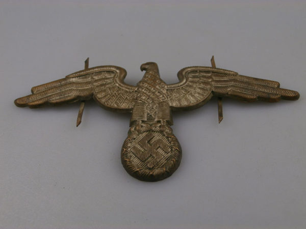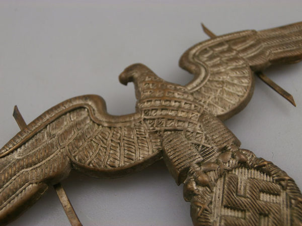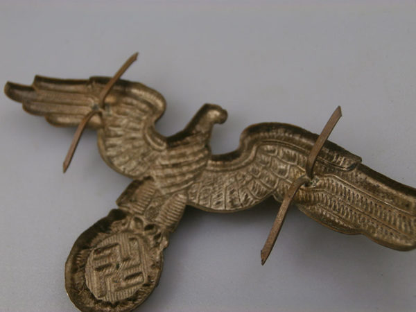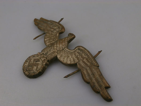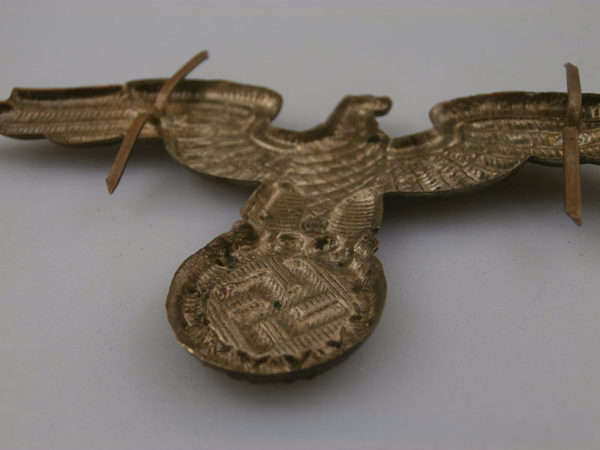 Interessante e rara aquila in metallo, per schirmmutze da Diplomatico del Reich, completa dei prongs posteriori. Usata in perfetto stato di conservazione e bella patina.