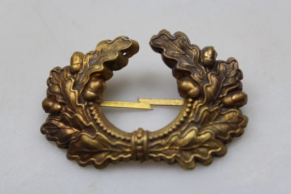 Serto dorato, completo di coccarda, per schirmmutze, completo dei prongs posteriori. Usato, buono stato di conservazione.