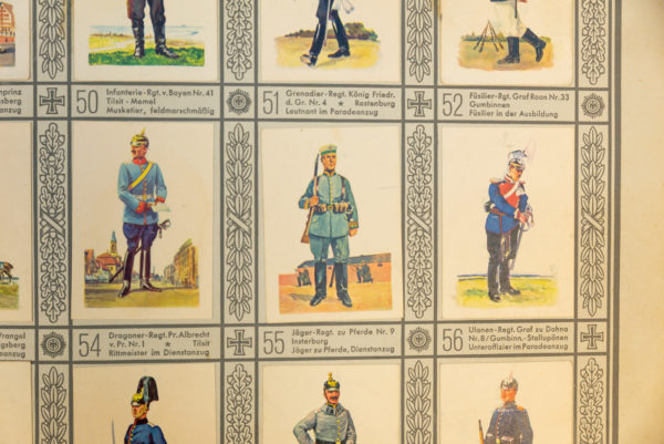 “Uniformen der Alter Armee” album di figurine prodotto da Waldorf Astoria Cigaretten Fabrik G.M.B.H.- München,le figurine per completare l’album venivano reperite nei pacchetti di tabacco e sigarette di questo fabbricante.Album completo in ottimo stato di conservazione.
