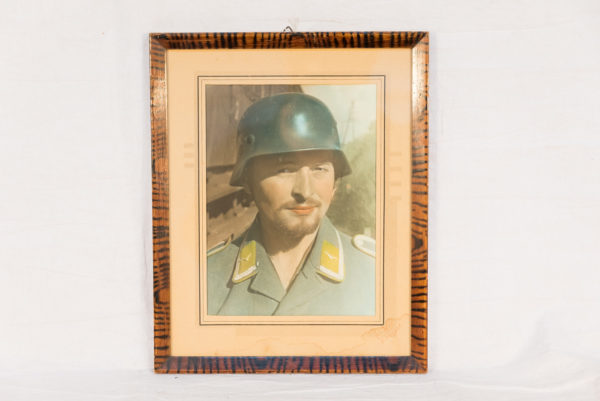 Bella foto da studio fatta a colori, in bella cornice in legno d’epoca, raffigurante un Unteroffizier della Luftwaffe con elmetto. Dimensioni cm 32×26. Buono stato di conservazione.