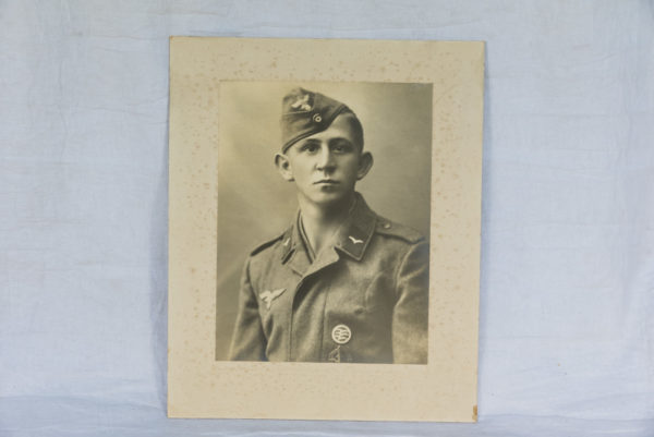 Foto ritratto da studio,raffigurante un soldato della Luftwaffe,decorato con distintivo da Aliantista e SA-Sportabzeichen,completo di passpartout,dimensioni cm 33×27. Buono stato di conservazione.