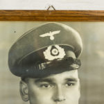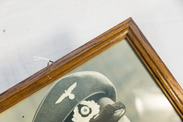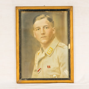 Foto da studio raffigurante un Soldato della Heer, in uniforme da parata Waffenrock, in cornice di legno d’epoca, dimensioni cm 32×25. Buono stato di conservazione.
