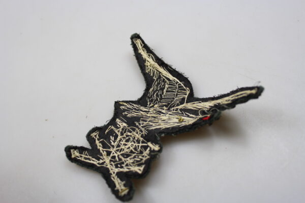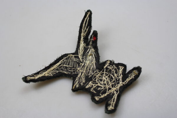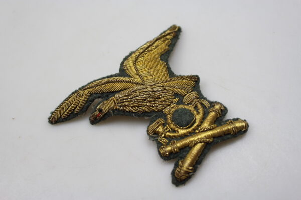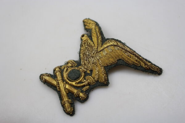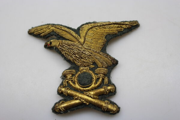 Fregio per berretto da Ufficiale di Artiglieria Alpina, configurazione anni 60′, ricamato in canuttiglia su panno grigio/verde. Usato, buono stato di