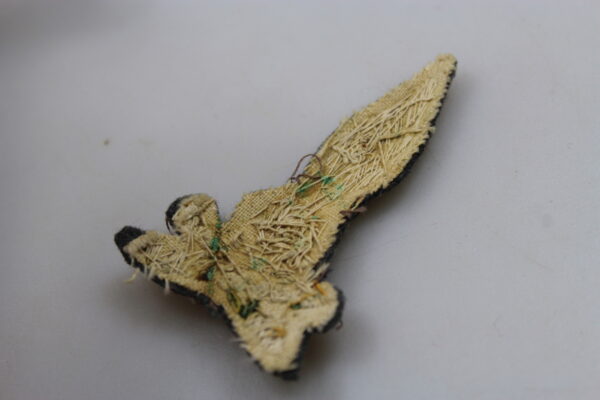 Fregio per bustina da Ufficiale di Artiglieria del Regio Esercito Italiano della Seconda Guerra Mondiale, ricamato su panno grigio/verde. Usato, buono stato di conservazione.