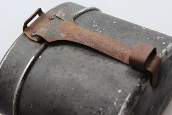 Ottima gavetta M.31 fatta in alluminio verniciato in colorazione feldgrau, in dotazione alla Wehrmacht, entrambi le parti marcate MKL-40 e completa di cinghia in cuoio. Usata, buono stato di conservazione.