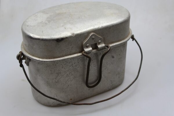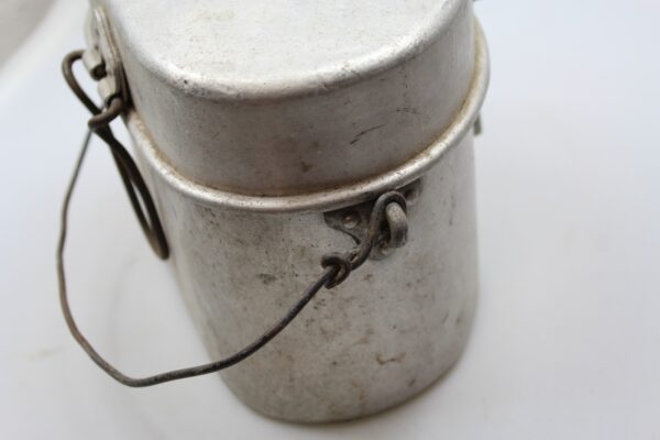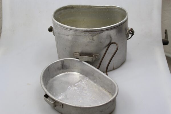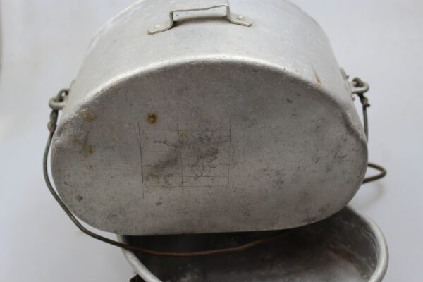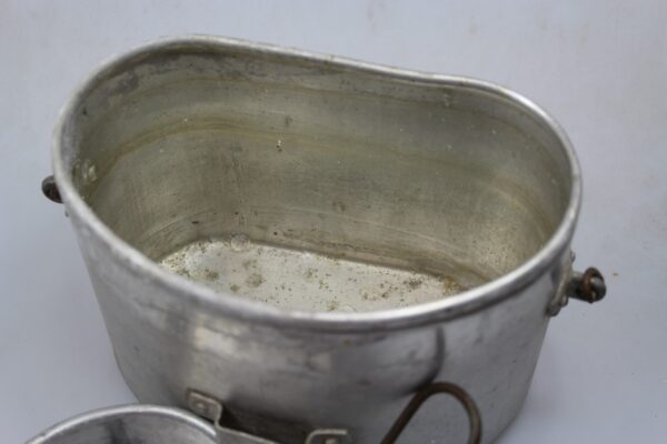 Gavetta fatta in alluminio del Regio Esercito Italiano della Seconda Guerra Mondiale, dimensioni maggiorate per truppe da montagna Alpini. Usata, buono stato di conservazione.