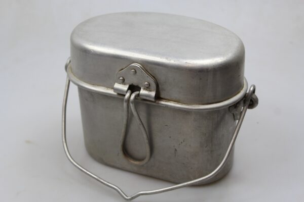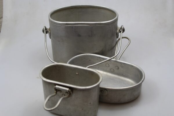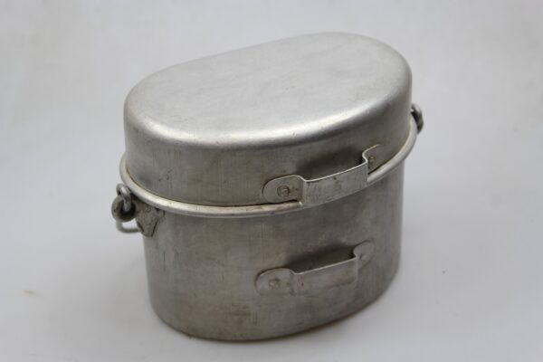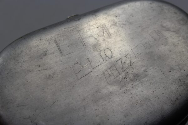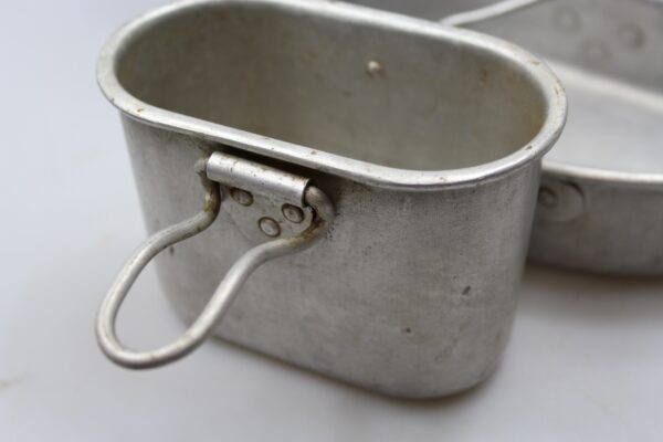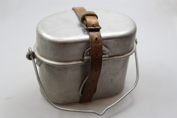 Gavetta fatta in alluminio del Regio Esercito Italiano della Seconda Guerra Mondiale, completa di gavettino supplementare e cinghia in cuoio. Inciso il nome del soldato. Poco usata, buono stato di conservazione.