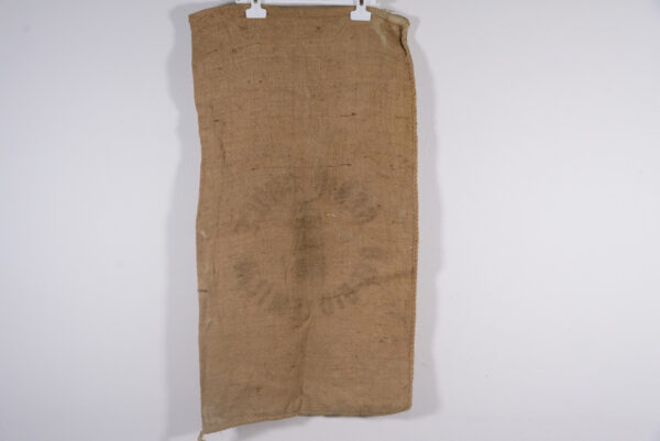 Sacco in juta del Genio Civile di Reggio Emilia con emblema del PNF, che riempito di terra, veniva usato per rinforzare gli argini del fiume Po in caso di piena. Dimensioni cm 90×50.Fondo di magazzino, buono stato di conservazione.
