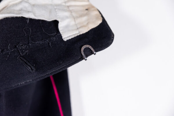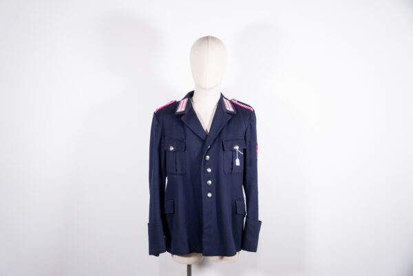 Completo, giacca e pantaloni, da Wachtmeister della Feuerschutzpolizei, giacca in panno blù tipo precoce con tasche basse a scomparsa e bottoni reggi cinturone posteriori, completa dei suoi corretti attributi, con aquila sul braccio “generica”, senza il nome della località di servizio. Pantaloni dritti in panno nero, con piping fucsia. Il tutto usato, in buono stato di conservazione.