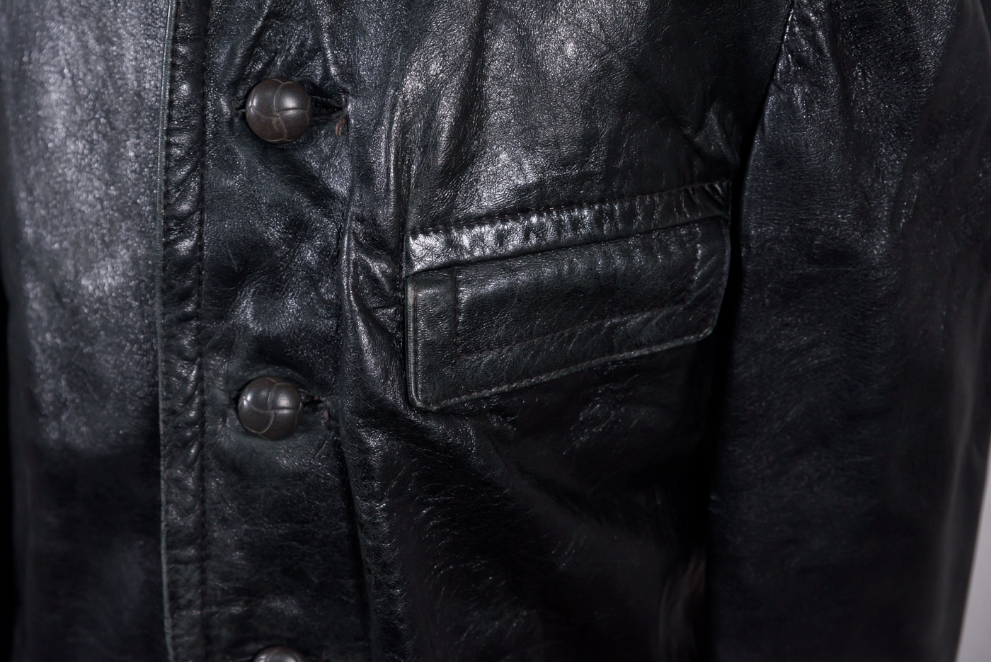 Tipica giacca fatta in pelle nera a tre tasche con collo alla “coreana” usata su navi, sommergibili e carristi, interno in panno di lana grigia, completa di etichetta non leggibile e taglia, bottoni tipici di fabbrica. Poco usata, molto buono lo stato di conservazione.