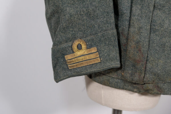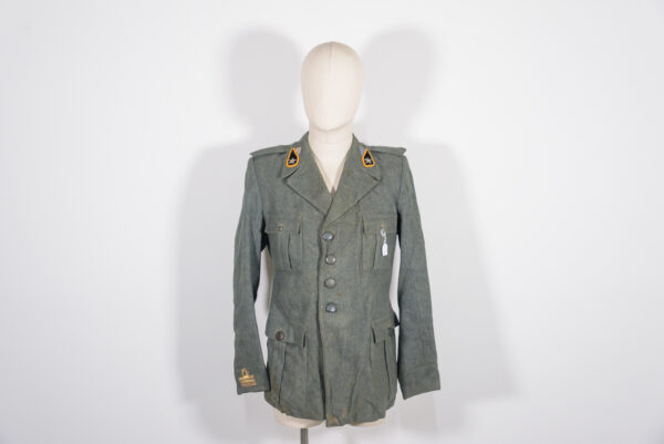 Giacca in panno truppa grigio/verde M.40, da Capitano di un Reggimento di Artiglieria della Divisione “Marche” del Regio Esercito Italiano della Seconda Guerra Mondiale, completa dei suoi corretti attributi. Usata, buono stato di conservazione.